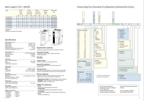 Features of Danfoss FC360:Reliable operation in many environments due ambient temperature of 50°C, unique cooling concept and coated PCB, 5–15% energy savings and reduced operational costs due to Automatic Energy Optimizer function, Fast cleaning and extended lifetime thanks to removable cooling fan, No need for external controller due to built-in PID controller, Fast and easy commissioning as a result of enhanced numerical display and clear application selection guidance.